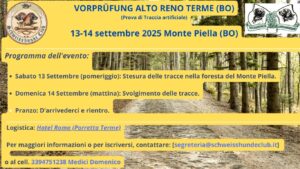 Nel fine settimana del 13 e 14 settembre 2025, lo Schweisshunde Club Italia ha organizzato in Emilia-Romagna l’ultima tappa annuale del percorso ufficiale delle Vorprüfungen 2025, ospitata tra Porretta Terme, Castelluccio e le foreste del Monte Piella, nel territorio dell’Alto Reno Terme (BO).